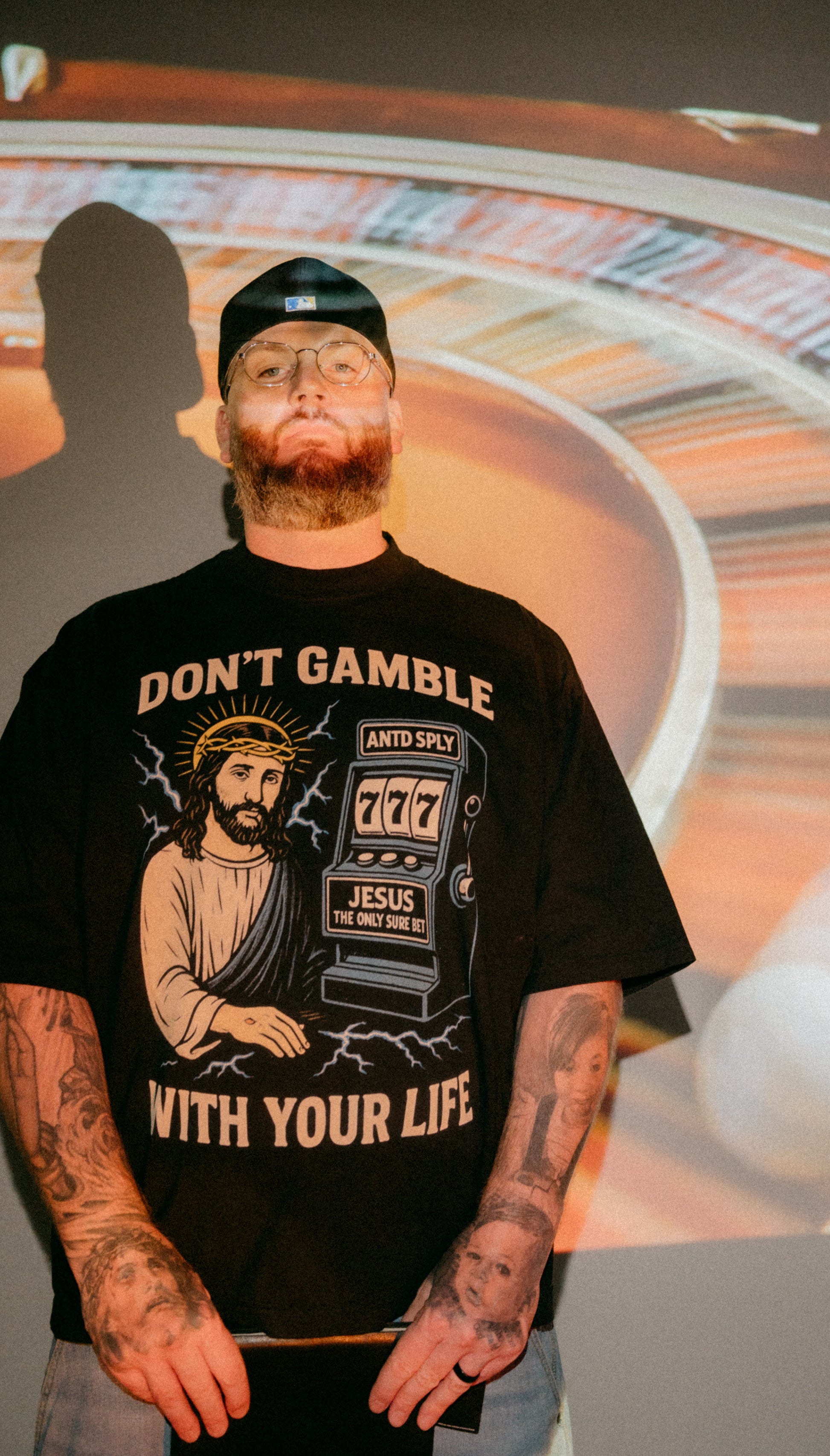 Printed on a black oversized drop shoulder T Shirt.